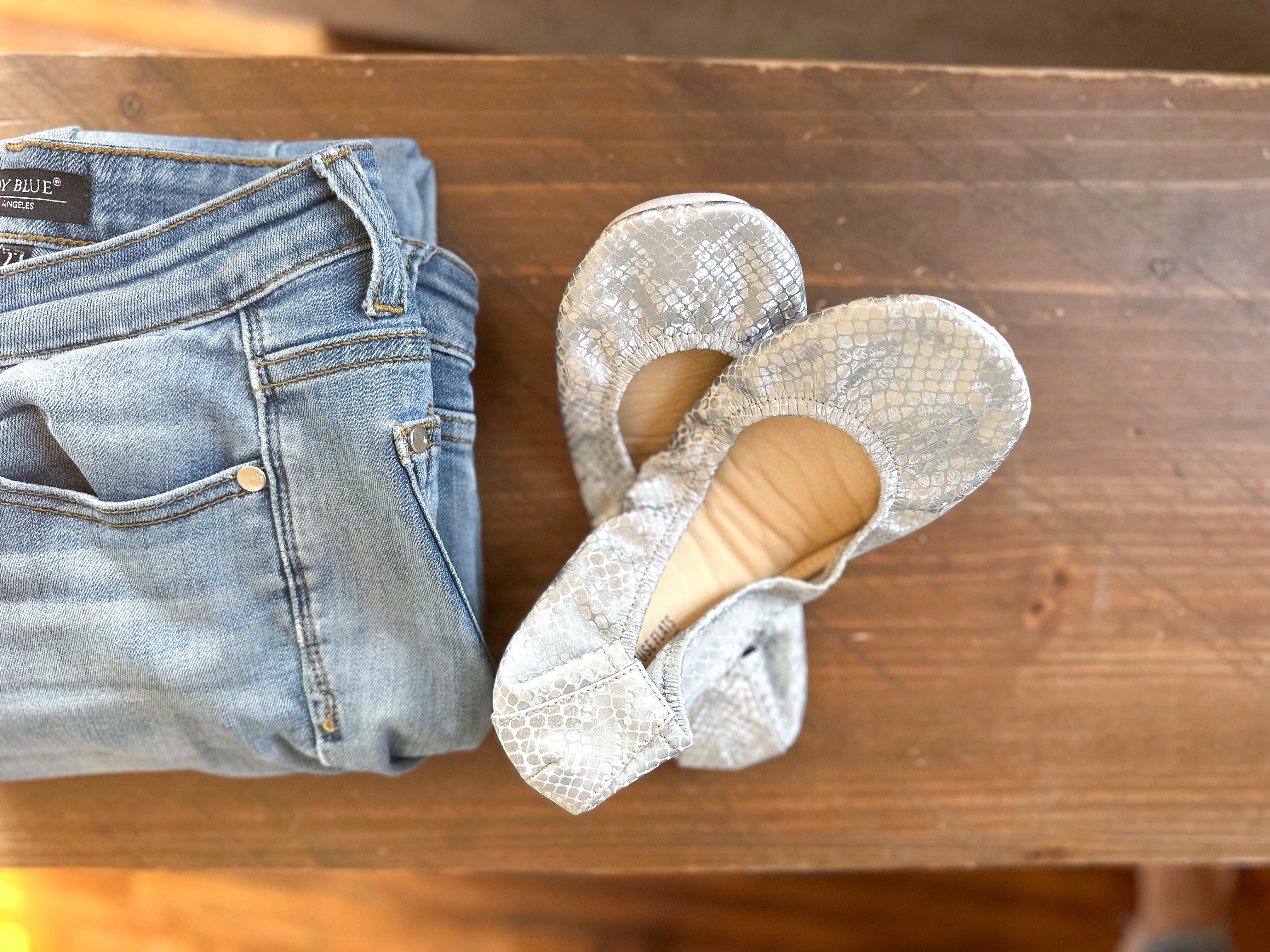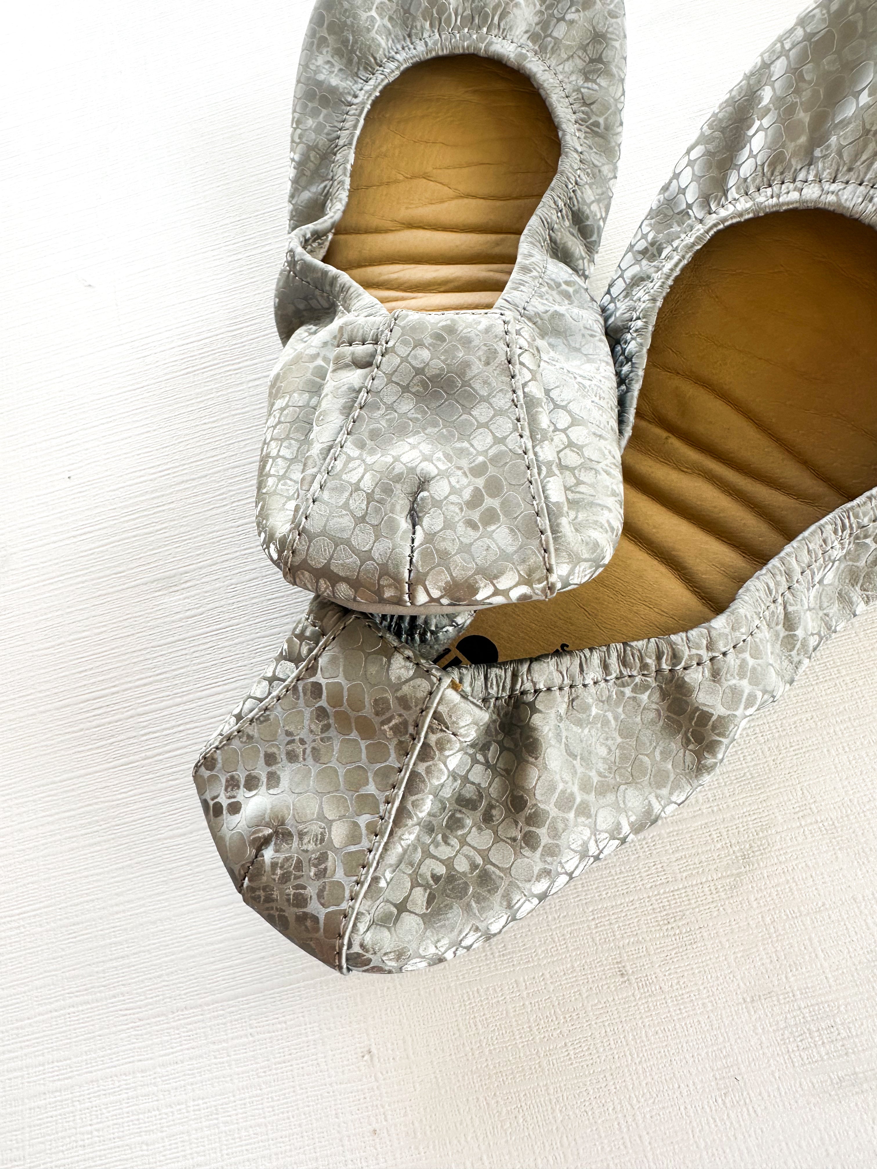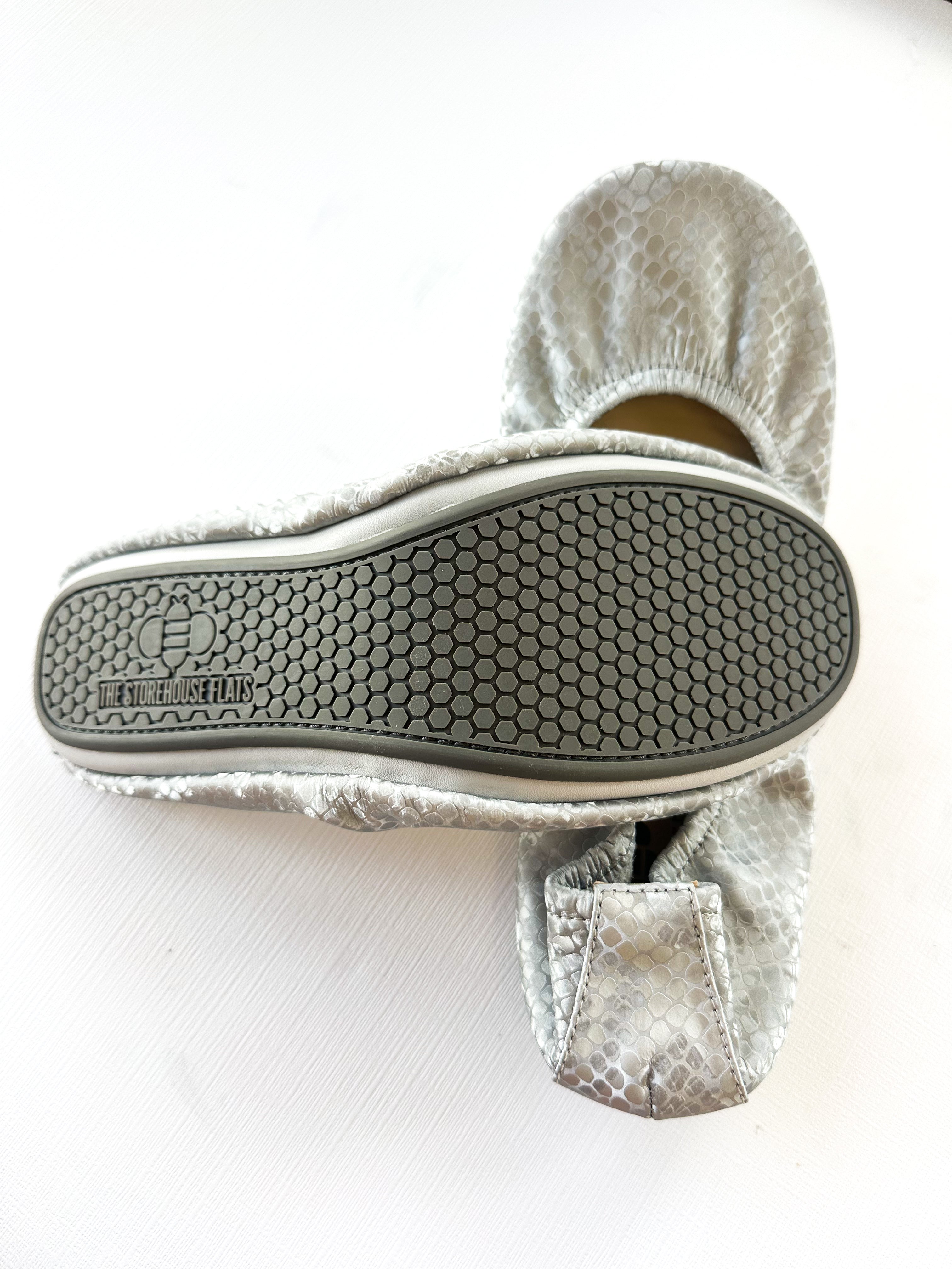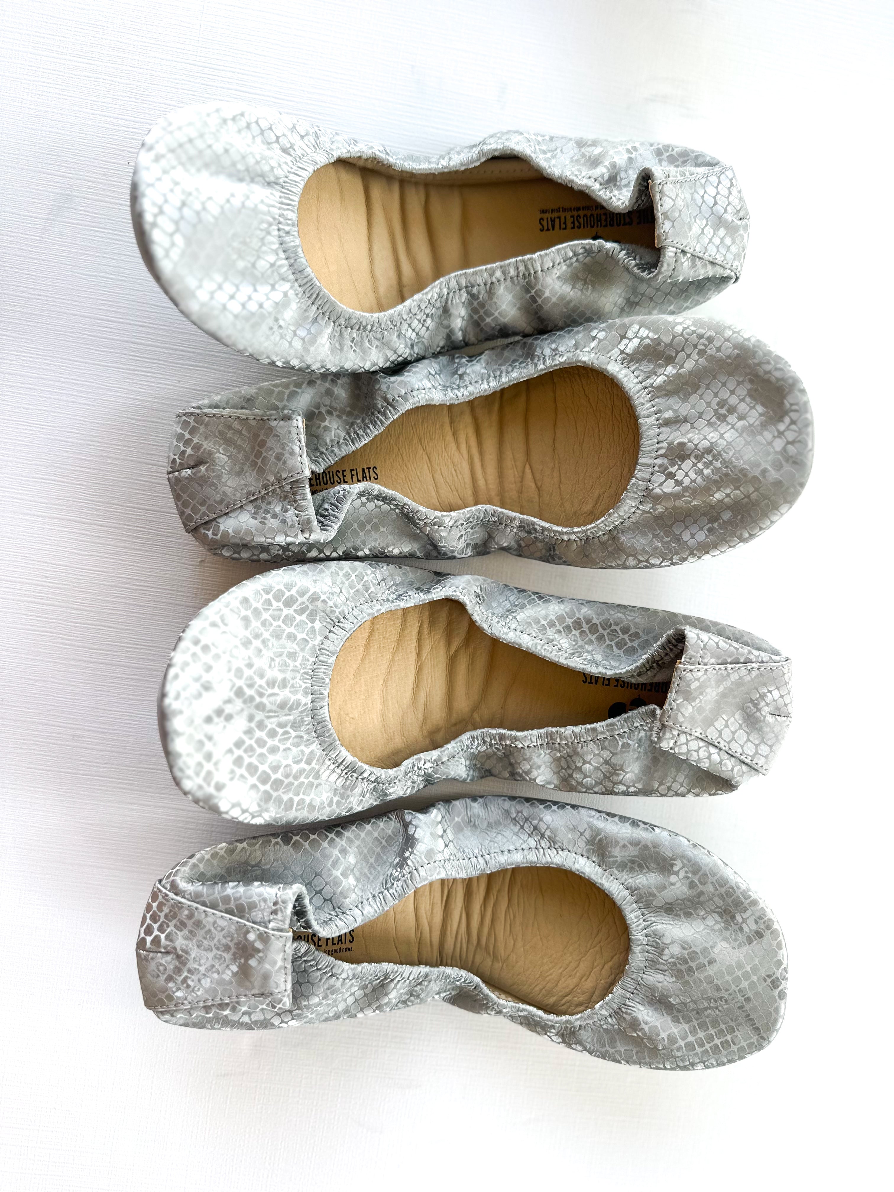 The second of its kind in an ultra soft, matte Dusty gray and silver colored snake print, this subtle shoe will be the perfect addition to your Storehouse Flats collection. If you love Garnet Snakes, you will love these!
